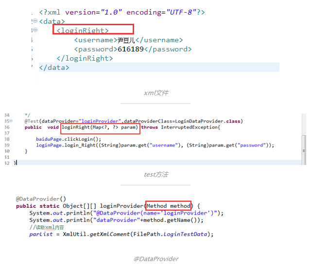 使用之后,个人觉得巧妙的地方是xml方法中将参数值的父节点命名为test方法名,然后在@DataProvider中通过test的method方法名来同xml数据对应,而在test方法中使用Map<?,?> param 获取;相同结构的xml文件则可以使用同一个DataProvider,节省了不少代码。