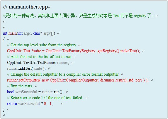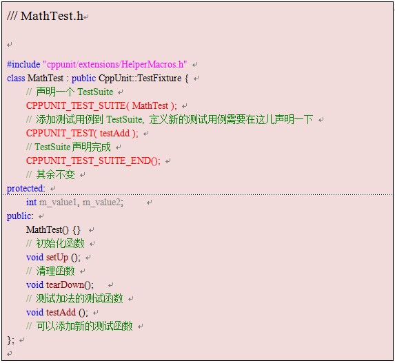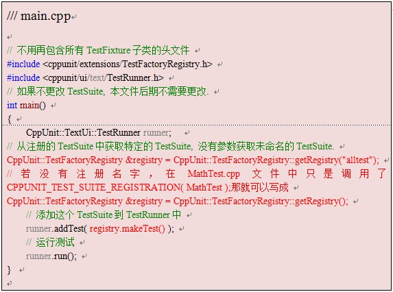 按照上面的方式,如果要添加新的测试用例,需要把每个测试用例添加到 TestSuite 中,而且添加新的 TestFixture 需要把所有头文件添加到 main.cpp 中,比较麻烦。为此 CppUnit 提供了 CppUnit::TestSuiteBuilder,CppUnit::TestFactoryRegistry 和一堆宏,用来方便地把 TestFixture 和测试用例注册到 TestSuite 中。下面是通常的使用方式(注意红色字体):