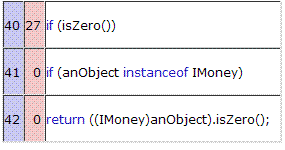 我们总是希望做单元测试的时候,让代码的测试覆盖率尽可能的达到100%,所以我们需要重构测试代码。从分析得知,第40行虽然执行了27次,但是从来没有测试if的判断条件为true的情况,所以我们要添加测试用例,测试isZero()返回为true的情况!因此,我们修改测试代码MoneyTest.java文件,在前边初始化地方加上一个Money实例,如下: