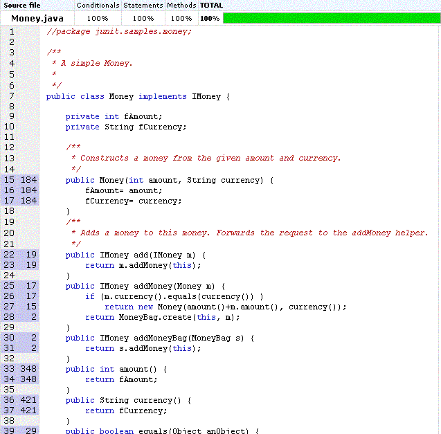 报告左边是包名,以及包下边的类;右边是主窗口,显示当前这个Money类的测试覆盖率,我们可以通过行号来查看到15、16、17行执行了156次,下边还会有两行一次也没有执行过,所以造成这个类整体的测试覆盖率不是100%。