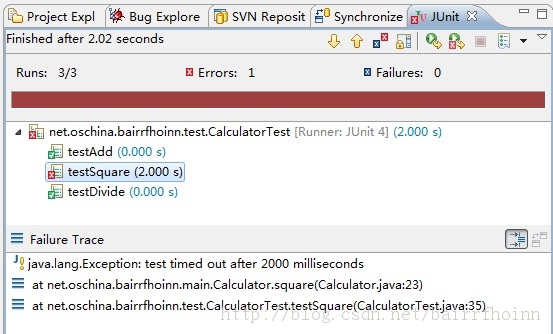 timeout参数表明了你预计该方法运行的时长,单位为毫秒,因此2000代表2秒。现在我们让这?测试方法运行壹下,看看失败时是什么效果。