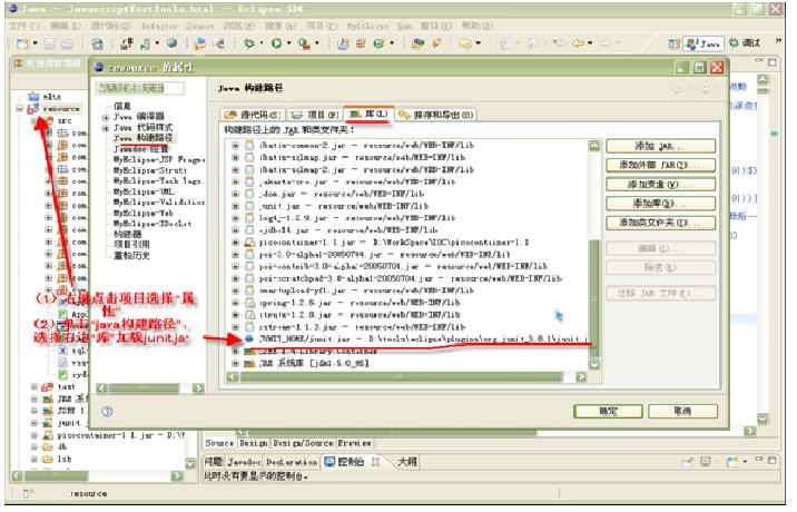 我将使用eclipse+myEclopse给大家介绍关于JUNIT的环境的简单配置;右键点击项目选择“属性”,在弹出窗口中到环境变量中添加junit.jar包,这样下一步我们可以进行单元测试了;