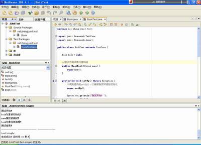 这里setUp和tearDown方法没什么好说的,是执行了对book对象的初始化和清理,不过testId和testName需要说明一下。前者是在对book的id属性进行测试,首先赋值为”001”,然后使用Assert的assertEquals方法查看id属性中存放的值是否是期待的值,由于我的期待值也是”001”,所以执行后这个用例应该是成功的;后者则是对book的name属性进行测试,也是首先赋值为”ASP”,然后使用Assert的assertEquals方法查看其值是否是期待的,由于我特意将期待值设定为根本不可能的”JSP”,因此这个用例执行后会出现一个错误。但请注意,由于我是特意要让测试出现错误,所以将期待值设定成了不可能的值,如果你是测试人员,请千万不要这么做,否则如果别的地方导致了错误,很容易给自己造成不必要的麻烦。