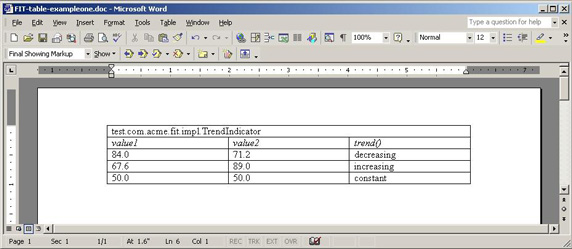 图 1 显示了用 FIT 创建的结构化模型。第一行是测试名称,下一行的三列是与输入(value1 和 value2)和预期结果(trend())有关的标题。