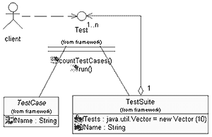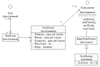 图2左边TestSuite包含了测试对象集合,右边包含了测试结果集。具体如何处理结果,以及包含哪些测试对象,并没有立即得出结论,而是尽量地延迟到具体实现的时候。例如,实现接口TestListener的JUnit中含有:junit.awtui.TestRunner、junit.swingui. TestRunner、junit.ui.TestRunner等,甚至客户用自己的类实现TestListener,从而达到多样化的目的。