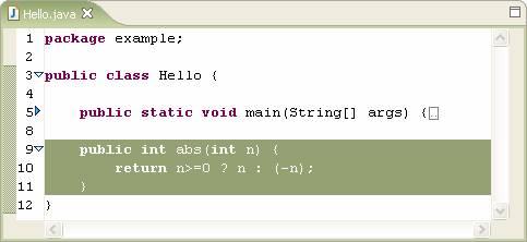 我们创建一个Java工程,添加一个example.Hello类,首先我们给Hello类添加一个abs()方法,作用是返回值: