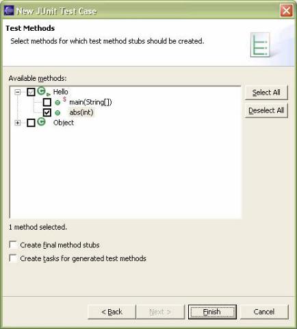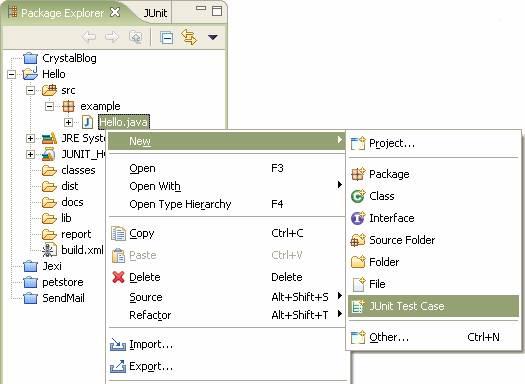 下一步,我们准备对这个方法进行测试,确保功能正常。选中Hello.java,右键点击,选择New->JUnit Test Case: