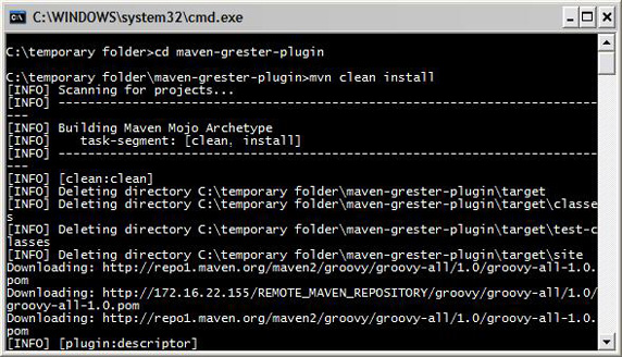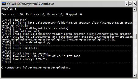 现在您终于可以构建插件直至完成。Grester 要求使用 Maven V2.0.5 或更高版本。如果使用早期版本,则会在编译和使用 Groovy-mojo-support 依赖关系中的功能时遇到问题。如果 $MAVEN_HOME/bin 目录是可执行文件系统路径的一部分,则可以从 maven-grester-plugin 目录(包含 Grester 的 pom.xml 文件的目录)中执行 mvn clean install 命令,如下所示: