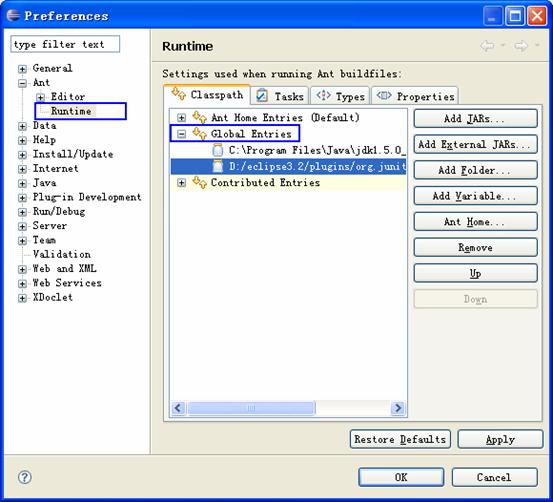 不过,在使用 Ant 运行 JUnit 之前,您需要稍作一些配置。打开 Eclipse 项界面,选择 Ant -> Runtime 项(见图7),将 JUnit 4.1 的 JAR 文件添加到 Classpath Tab 页中的 Global Entries 设置项里。记得检查一下 Ant Home Entries 设置项中的 Ant 版本是否在 1.7.0 之上,如果不是请替换为新版本的 Ant JAR 文件。