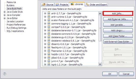 3. 选定项目,右键选择项目的属性,然后通过 Add JARs 将步骤 2 中 lib 文件夹下的所有 Jar 添加到项目的 Build Path 下,如图 2
