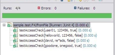 3. 运行测试,因为 Feed4Junit 是 JUnit 的扩展,所以运行方式与 JUnit 完全相同,即以 JUnit 运行即可,运行结果如图 4 所示,我们可以看到,Data.xls 中的数据已全部传入测试方法并运行。