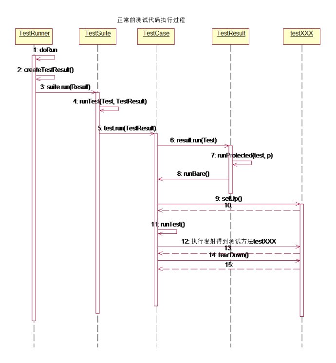 先看看在Junit中为什么要使用命令模式,在这我们先看看Junit的执行过程的时序图,启动一次执行时,TestRunner先解析加载后,然后通过TestSuite、TestCase中的run方法继续解析成一个个Junit的测试方法(testcase),紧接着通过TestResult调用TestCase中的执行方法,通过TestCase中的runBare方法终调我们自己写的测试代码(含有testXXX的测试方法)。