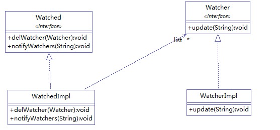 Watcher及其子类维护一个观察者列表,当需要通知所有的Watched对象时调用notifyWatchers方法遍历Watched集合,并调用它们的update方法更新。而具体的观察者实现Watched接口(或者抽象类),提供具体的更新行为。