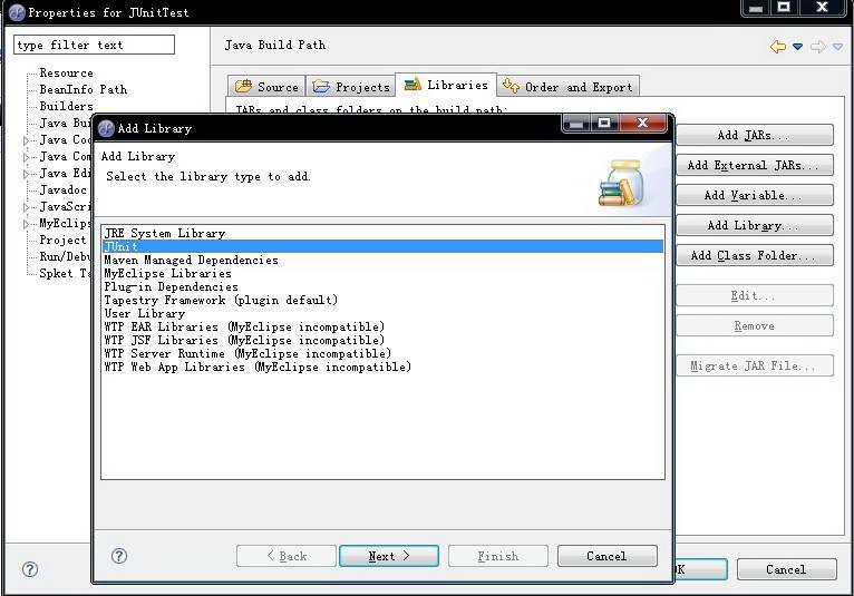 我讲的例子,开发环境是myeclipse6.0,在这个开发环境中其实已经集成了我们所要的JUnit测试相关的类,只要我们在环境中设置即可,如下图所示,当我们建立一个java工程之后点击工程属性即按下图所示设置好即可: