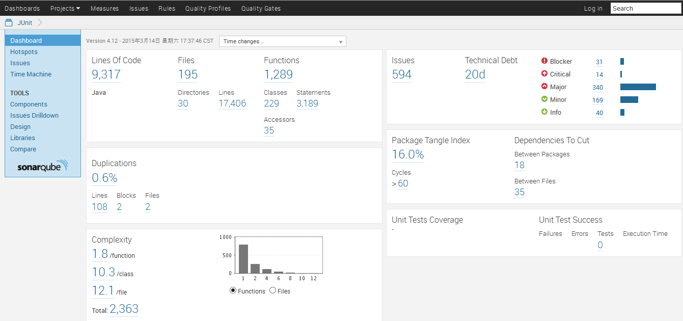 二、下面为Junit的简要说明 JUnit是一个开放源代码的Java测试框架,用于编写和运行可重复的测试。他是用于单元测试框架体系xUnit的一个实例(用于java语言)。它包括以下特性: 1、用于测试期望结果的断言(Assertion) 2、用于共享共同测试数据的测试工具 3、用于方便的组织和运行测试的测试套件 4、图形和文本的测试运行器 我从网上下载了Junit的源码并用SonarQube对其进行了代码质量分析,下图为分析结果: