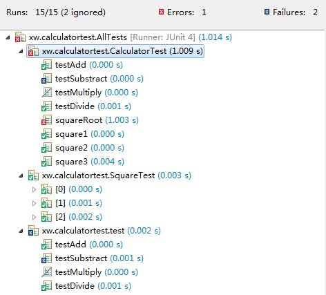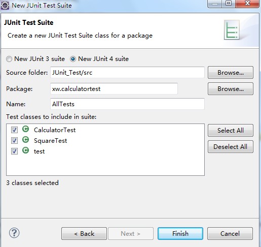打包测试类叫做AllTests,需要打包测试的三个测试类是CalculatorTest,SquareTest和test。点击Finish完成打包测试,生成的打包测试类大吗如下: