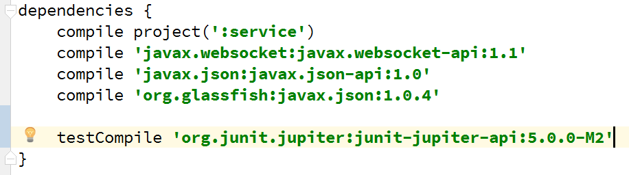 IntelliJ IDEA支持在不需要额外库(例如 Gradle 或 Maven 插件)的情况下运行JUnit 5编写的测试,你所要做的的事情是添加JUnit 5的依赖关系。这里是我们在JUnit 5 M2版本中添加 Gradle 的依赖关系: