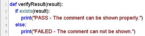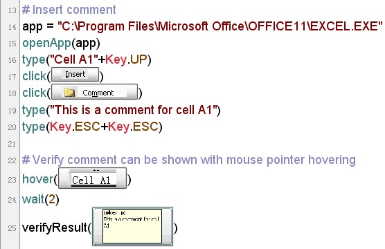 图 3 中所示脚本片段中,从 15-19 行完成了打开 Excel 并创建单元格注释的过程。单元格注释的显示触发和显示验证仅占用了 22-24 三行代码。所调用的 hover() 方法从当前屏幕显示上自动匹配截图参数所示区域,获取其位置,将鼠标指针悬停于该矩形区域的中心位置,激活注释显示。而在 Sikuli“视觉”能力的支持下,验证注释是否正确显示只需用 verifyResult() 方法“一瞥”即可。该方法的实现如图 4 所示,调用 exists() 方法,即能判断当前屏幕中是否显示有相应注释。