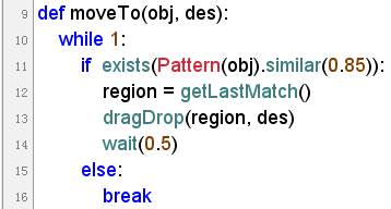 在该方法中,对于图片缩略图应用 exists() 方法进行检索时,进行了图像相似度(取值区间为 0~1)的调整,Sikuli 中缺省情况下的相似度设置为 0.7,为了在图片内容类似的情况下进行正确的区分,可用到 similar() 方法适当提高检索时的相似度,以避免匹配到其他类似区域。