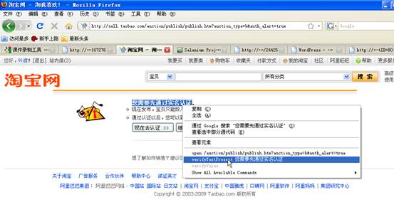 在Firefox里执行上述步骤,前面4步的操作会被Selenium IDE忠实的记录下来,第5步验证怎么办?选中相应文字,点击鼠标右键,选择相应的命令,如下图所示(在Show All Available Commands里有更多的可用命令供选择):