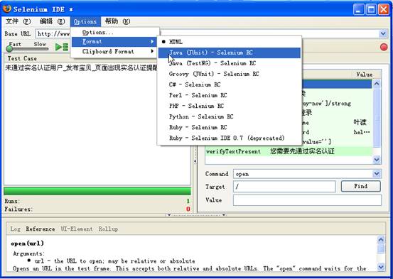 只在Selenium IDE里运行是远远不能满足需求的,我们需要为测试用例增加一些特性以使其能自动运行持续回归运行于不同的浏览器上,而Selenium IDE可以方便实现用例转换为自动化脚本,而且支持多种语言,如下图所示:
