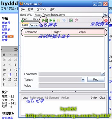 上图标明了一些Selenium IDE的主要功能。其中,由Command,Target,Value组成的表格是脚本,每个脚本都是由一条一条的Action(行为)组成,而每个Action又由(Command,Target,Value)三者组成。Command是上文《API参考手册》提到的内容,Target指的是Web中的某个对象,比如:文字,输入框等等,如果选取对象呢?呵呵,这里用到了XPath,不熟悉可以参考《XPath的使用》,而Value是这个对象的值。