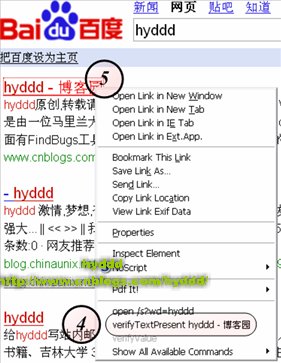 (4).进入搜索结果页面后,右键单击第一条记录(即:hyddd - 博客园),在右键弹出菜单中,单击“Verify TestPersent hyddd - 博客园”。