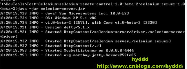 打开cmd进入selenium-server-1.0-beta-2目录,输入“java -jar selenium-server.jar”(需要先安装JRE),启动Selenium测试服务器。