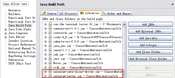 图 5. selenium-server 及 selenium-java-client-driver 的 jar 包导入 RFT 中的示意图