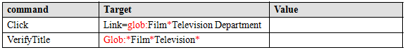 为了使selenese命令中指明使用globbing范本参数,你可以在范本前加上“glob: ”前缀。当然globbing是默认范本模式,因此不加也是可以的。