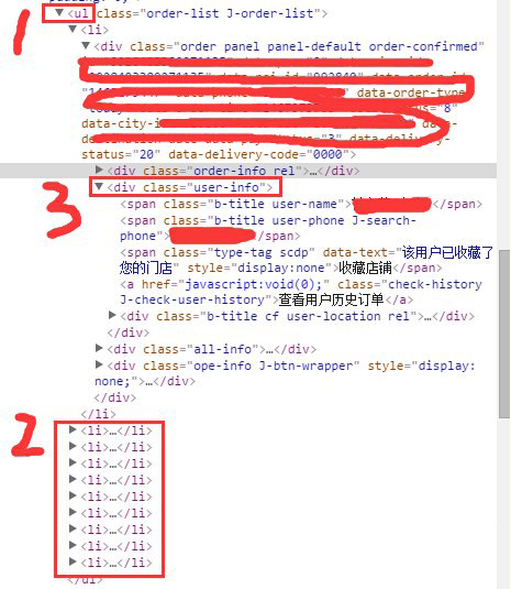 简单说是:用<ul>表示该页的所有订单,<ul>下面的每一个<li>表示一个具体订单,<li>下面的类型为user-info的<div>表示该订单的用户信息,<div>下面是姓名电话等信息。