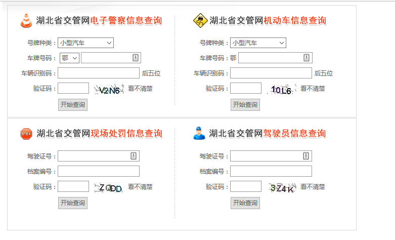 可以看到共有4种查询种类,我只要查询违章数据,所以分析第一个 电子警察信息查询 好了,用firebug分别查看车牌号码、车辆识别码、验证码输入框,可以得到id属性,分别为:carNum1、carAuthCode1、captcha1。