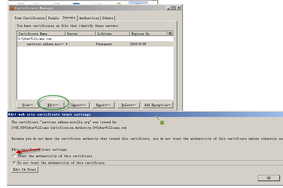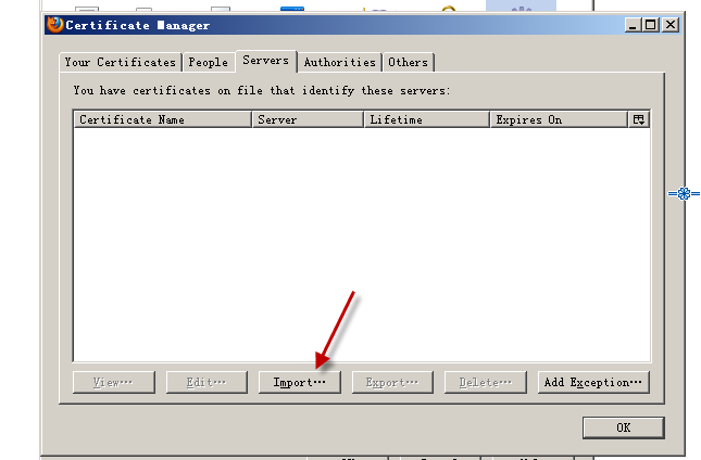 a) 导入证书:打开firefox的certificate manager,然后点击导入