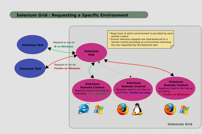 上图中的selenium hub类似于一个中央处理器,selenium node是远程需要执行测试的节点,selenium Test case是运行在hub上的测试用例。