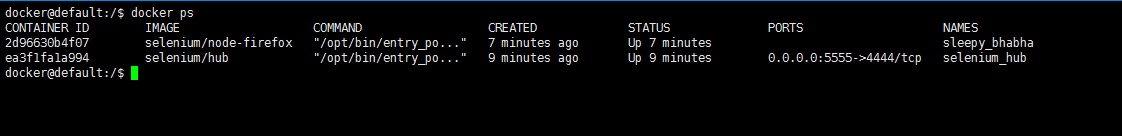 NAMES:注意到,在启动node时我们没有指定--name属性,所以他随机命名了sleepy_bhabha,而启动hub我们指定了--name属性,hub容器的name为我们指定的selenium-hub