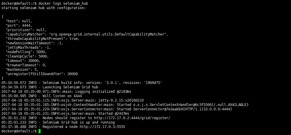 由于我们是在后台启动这2个镜像文件的,我们想要看容器启动的log怎么办,以selenium_hub为例子,我们输入docker logs selenium_hub有如下信息: