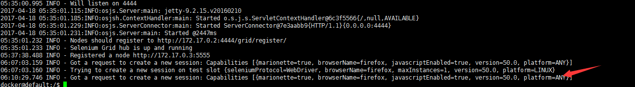 首先,这是和docker无关的,你在真实的PC机上也是同样的结果!既然和docker无关那是selenium-server-standalone-3.3.1.jar这个包的bug了?答案是:也不是!!那到底是什么我们来看看是什么原因。我们打开hub的log(docker logs selenium_hub)。截图如下: