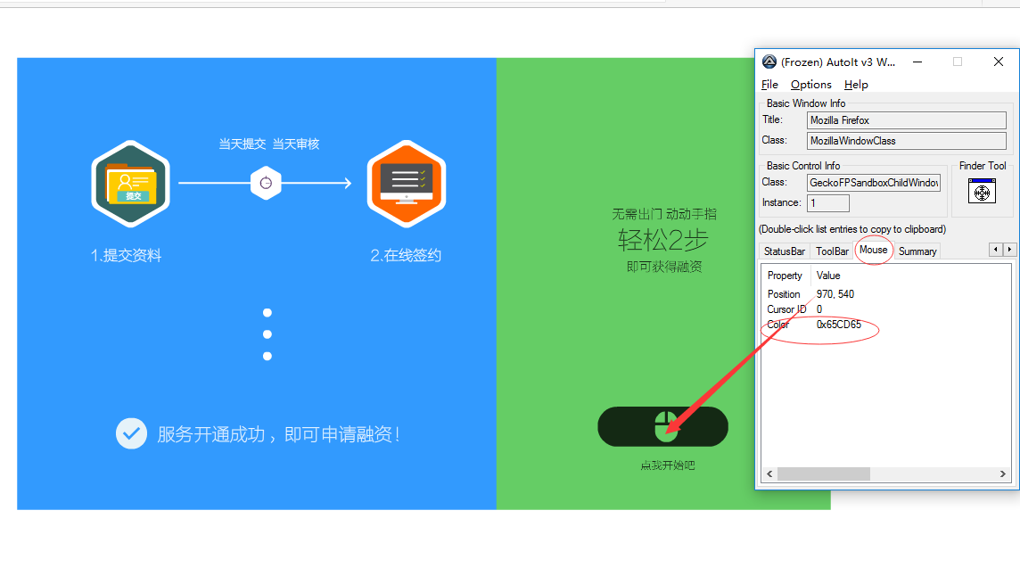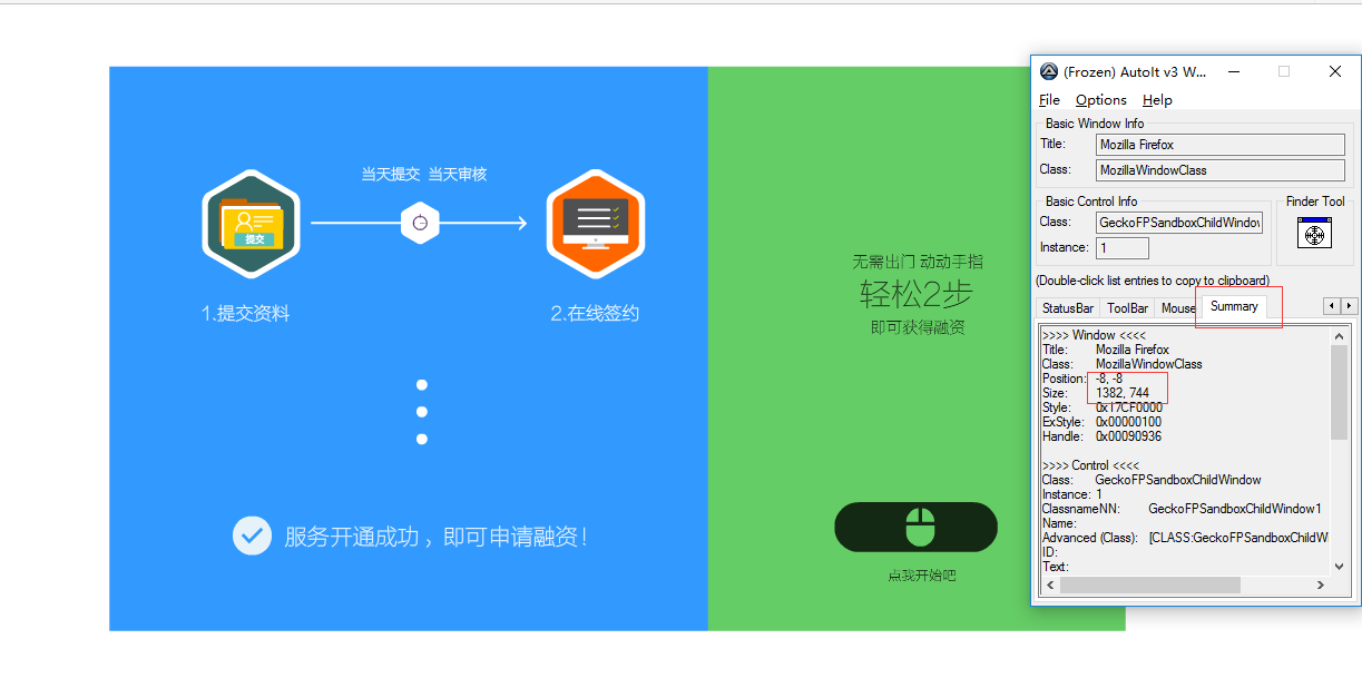 需要注意的是,由于Firefox中嵌入的flash是非windows标准控件,我们只能用相对坐标来点击。关于以上坐标值得获取,依然用Autoit windows info这个工具获取如下: