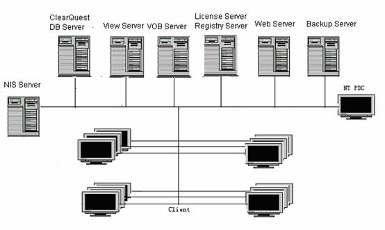 在实际中可以将VOB Server与License Server及Registry Server配置在一台机器上。这些Server中只有VOB Server与View Server的对配置的要求比较高,而且一个Registry Server上只能启动一个Windows Region与UNIX Region,所以建议每个项目配置一个Registry Server,配置项目自己的Region。