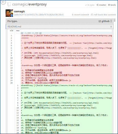 小心翼翼地 Fork 了朴灵大大 (@JacksonTian) 的 EventProxy 项目,本地改好提交,同步到服务器,怀着激动的心情发出 Pull Request……这时发现问题了。我发现 diff 图表显示的更新并不仅是我修改的那几行,而是整个文件都显示为已修改。(下图为示意图)