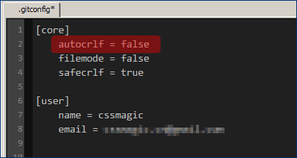 在 [core] 区段找到 autocrlf,将它的值改为 false。如果没找到,在 [core] 区段中新增一行:(终效果见图)