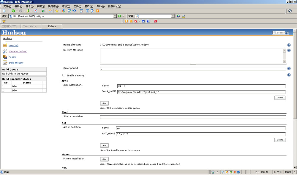 这样可以了。因为下载的是一个 WAR 文件,所以如果愿意,可以将它部署在 Tomcat 或 JBoss 等容器中。这完全由您自己决定。当然,Hudson 假设在安装它的机器上运行着 Java 5,而且如果定义了 JAVA_HOME 环境变量,Hudson 会使用它。(正如前面提到的,Hudson 需要 Java 5。)