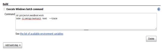 2. 要运行ruby脚本,使用的rake命令,因此这里我们需要将这个命令配置好,同时由于我们使用了ci_reporter,所以如上一节一样,我们稍微修改一下命令