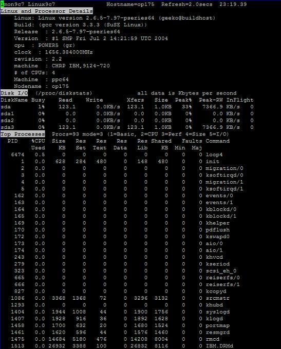 说明了 Linux 版本的 nmon 的详细信息,其中显示了 CPU(这里是 2 CPU 的 POWER5 计算机,并打开了 SMT)、LPAR 统计、内存使用、网络统计、文件系统使用和磁盘统计的详细信息。注意:该 LPAR 的物理 CPU 仅在 SUSE SLES9 Service Pack 1 和 Red Hat EL 4 Update 1 中是可用的。