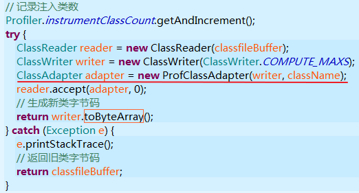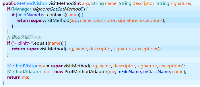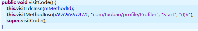 再利用org.objectweb.asm.MethodAdapter的visitXXX 系列(对应功能可到这里查:http://t.cn/SqTMQM,注入采样代码,如下