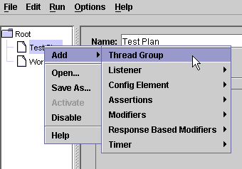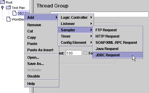 现在,我们将指定如何与 DB2 UDB 通信。我们要以 JDBC 请求的形式与 DB2 UDB 进行通信。右击刚才建立的线程组( DB2 Test),选择 Add => Sampler => JDBC Request。