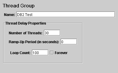 在下一个屏幕中(参见 图 3),您可以定义测试中所要包含的线程或模拟用户的数量。 等候周期(Ramp-Up Period)指定了 JMeter 在向数据库暴露模拟用户之前应当等待的时间。例如,如果我们有 30 个模拟用户,等候周期为15秒,那么我们会每秒向数据库暴露 2 个用户(30 个用户/15 秒)。如果将等候周期设置为 0,JMeter 会自动一次启动所有模拟用户。循环计数(Loop Count)指定了 JMeter 要重复测试的次数。在这个屏幕中,还可以修改我们的线程组名称。接下来按 图 3 所示输入设置,这将为我们提供 30 个同时启动的用户。该测试将运行 100 次。