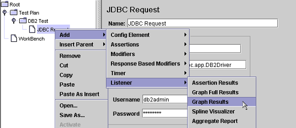 这时,我们真正定义了一个 JMeter 测试,它将测试我们的 DB2 数据库。此时我们面临的问题是没有办法看到测试结果。为了解决这个问题,请右击 JDBC Request,然后选择 Add => Listener => Graph Results ,如下图所示: