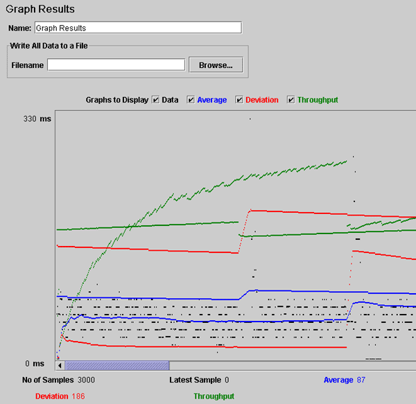 请注意在屏幕右上角闪亮的屏幕区域。这个区域表明测试正在运行。在这个时候,您应当看到,图形被有关信息填充,信息的内容是执行指定查询所需要的时间(平均时间)(参见 图 8)。