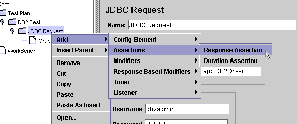 要添加断言,需要右击 JDBC Request,然后选择 Add => Assertions => Response Assertion,如 图 10所示。